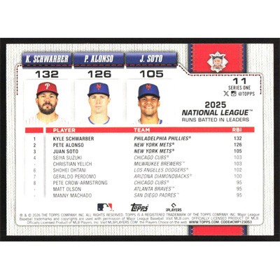 This is a 2026 Topps Kyle Schwarber, Pete Alonso and Juan Soto League Leaders baseball card. The card is #11 and pictures show condition.