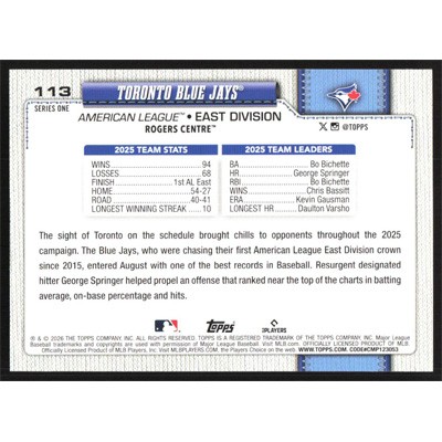 This is a 2026 Topps Toronto Blue Jays Team Card baseball card. The card is #113 and pictures show condition.