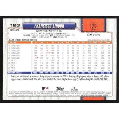 This is a 2026 Topps Francisco Lindor baseball card. The card is #123 and pictures show condition.