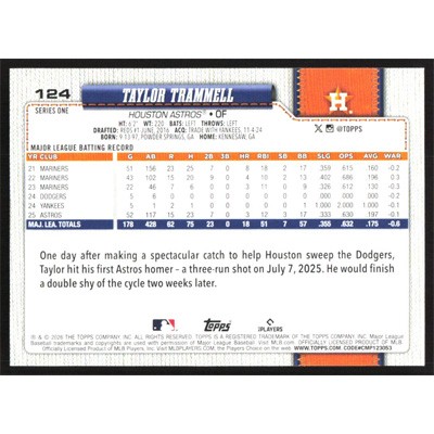 This is a 2026 Topps Taylor Trammell baseball card. The card is #124 and pictures show condition.