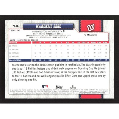 This is a 2026 Topps MacKenzie Gore baseball card. The card is #14 and pictures show condition.