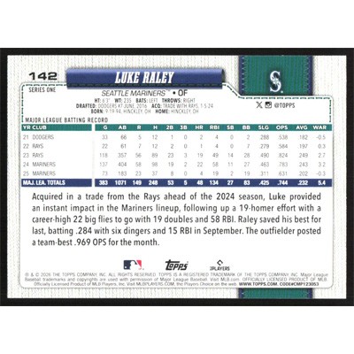 This is a 2026 Topps Luke Raley baseball card. The card is #142 and pictures show condition.