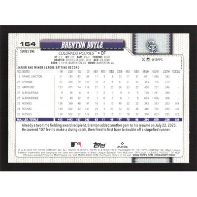 This is a 2026 Topps Brenton Doyle baseball card. The card is #164 and pictures show condition.