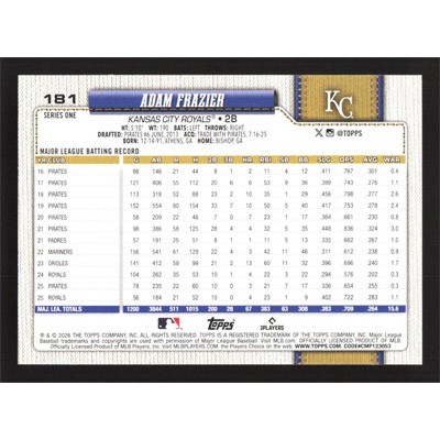 This is a 2026 Topps Adam Frazier baseball card. The card is #181 and pictures show condition.