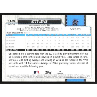 This is a 2026 Topps Otto Lopez baseball card. The card is #194 and pictures show condition.