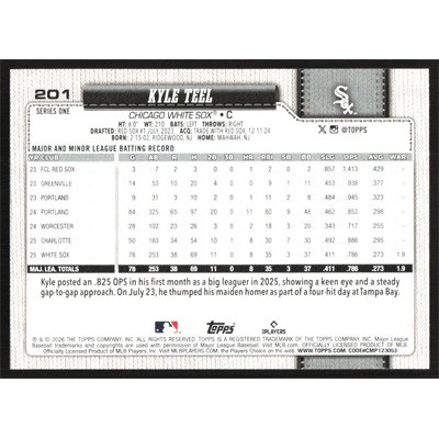 This is a 2026 Topps Kyle Teel baseball card. The card is #201 and pictures show condition.