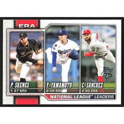 This is a 2026 Topps Paul Skenes, Yoshinobu Yamamoto and Christopher Sanchez League Leaders baseball card. The card is #203 and pictures show condition.