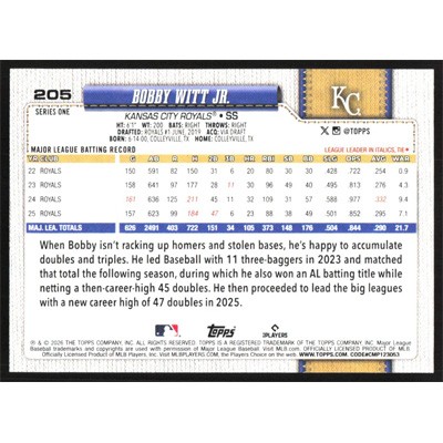 This is a 2026 Topps Bobby Witt Jr. baseball card. The card is #205 and pictures show condition.