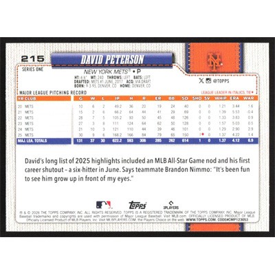 This is a 2026 Topps David Peterson baseball card. The card is #215 and pictures show condition.