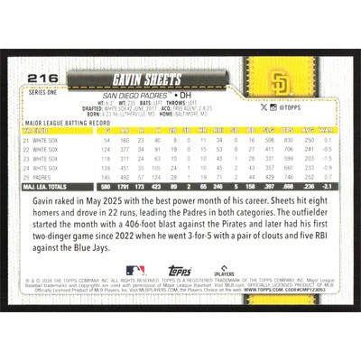 This is a 2026 Topps Gavin Sheets baseball card. The card is #216 and pictures show condition.