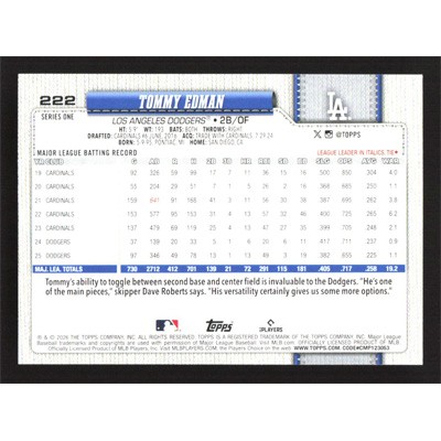 This is a 2026 Topps Tommy Edman baseball card. The card is #222 and pictures show condition.