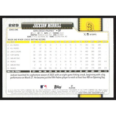 This is a 2026 Topps Jackson Merrill baseball card. The card is #229 and pictures show condition.