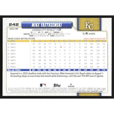 This is a 2026 Topps Mike Yastrzemski baseball card. The card is #242 and pictures show condition.