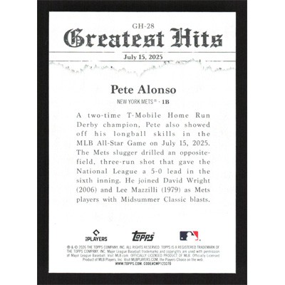 This is a 2026 Topps '25 Greatest Hits Pete Alonso baseball card. The card is #GH-28 and pictures show condition.