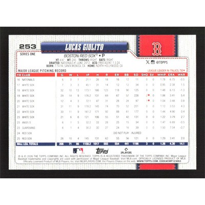 This is a 2026 Topps Lucas Giolito baseball card. The card is #253 and pictures show condition.