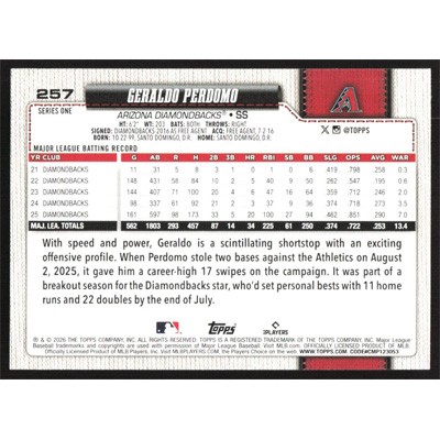 This is a 2026 Topps Geraldo Perdomo baseball card. The card is #257 and pictures show condition.