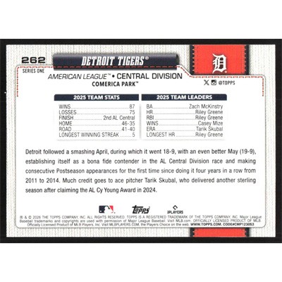 This is a 2026 Topps Detroit Tigers Team Card baseball card. The card is #262 and pictures show condition.