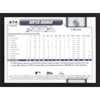 This is a 2026 Topps Hunter Goodman baseball card. The card is #274 and pictures show condition.