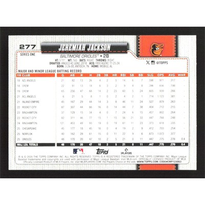This is a 2026 Topps Jeremiah Jackson baseball card. The card is #277 and pictures show condition.