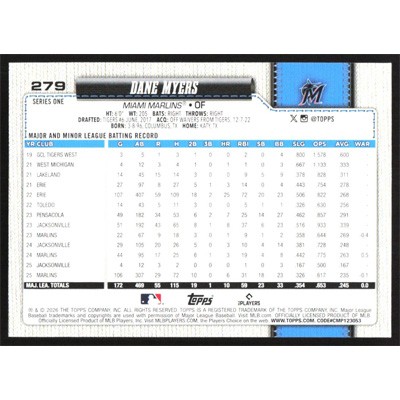 This is a 2026 Topps Dane Myers baseball card. The card is #279 and pictures show condition.