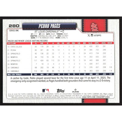 This is a 2026 Topps Pedro Pages baseball card. The card is #280 and pictures show condition.