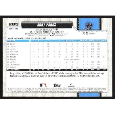 This is a 2026 Topps Eury Perez baseball card. The card is #285 and pictures show condition.