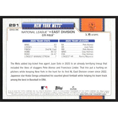 This is a 2026 Topps New York Mets Team Card baseball card. The card is #291 and pictures show condition.