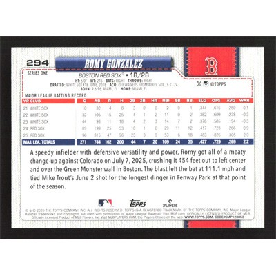 This is a 2026 Topps Romy Gonzalez baseball card. The card is #294 and pictures show condition.