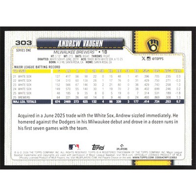 This is a 2026 Topps Andrew Vaughn baseball card. The card is #303 and pictures show condition.