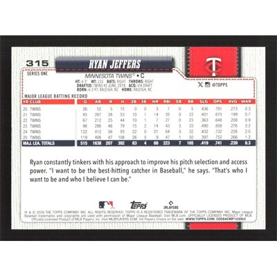 This is a 2026 Topps Ryan Jeffers baseball card. The card is #315 and pictures show condition.