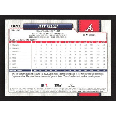 This is a 2026 Topps Jake Fraley baseball card. The card is #323 and pictures show condition.