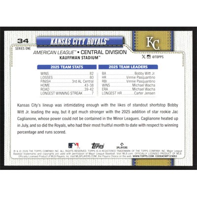This is a 2026 Topps Kansas City Royals Team Card baseball card. The card is #34 and pictures show condition.