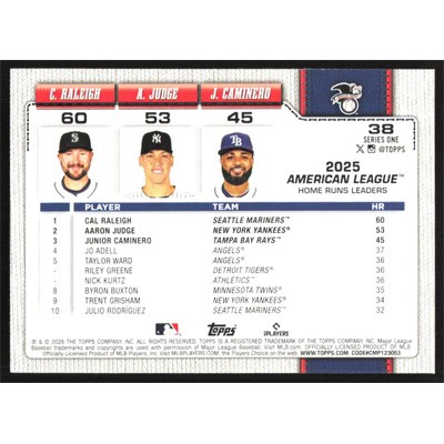 This is a 2026 Topps Cal Raleigh, Aaron Judge and Junior Caminero League Leaders baseball card. The card is #38 and pictures show condition.