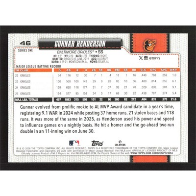 This is a 2026 Topps Gunnar Henderson baseball card. The card is #46 and pictures show condition.