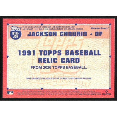 This is a 2026 Topps '91 Relics Jackson Chourio Game-Used Bat baseball card. The card is #91R-JCH and pictures show condition.