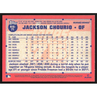 This is a 2026 Topps '91 Silver Pack Chrome Jackson Chourio baseball card. The card is #91C-71 and pictures show condition.