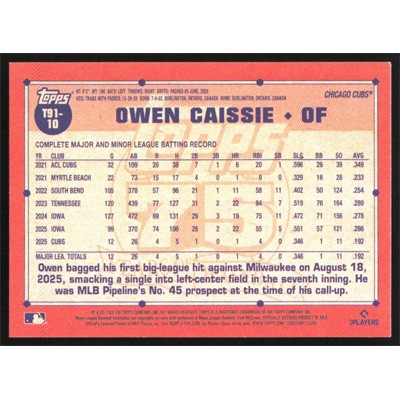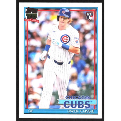 This is a 2026 Topps '91 Owen Caissie baseball card. The card is #T91-10 and pictures show condition.