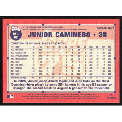 This is a 2026 Topps '91 Junior Caminero baseball card. The card is #T91-62 and pictures show condition.
