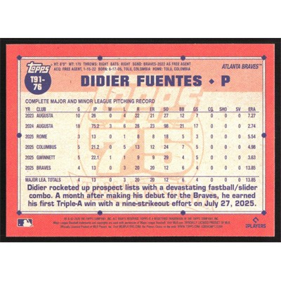 This is a 2026 Topps '91 Didier Fuentes baseball card. The card is #T91-76 and pictures show condition.