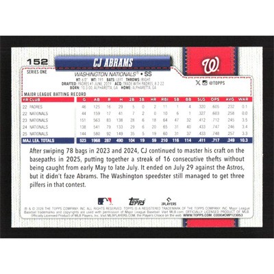 This is a 2026 Topps Aqua Rainbow Foil CJ Abrams baseball card. The card is #152 and pictures show condition.