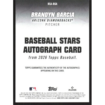 This is a 2026 Topps Baseball Stars Autographs Brandyn Garcia autographed baseball card. This card has been signed, in blue, by Brandyn Garcia, and is certified authentic by Topps. The card is #BSA-BGA and pictures show condition.