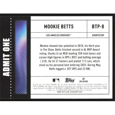 This is a 2026 Topps Big Ticket Players Mookie Betts baseball card. The card is #BTP-8 and pictures show condition.