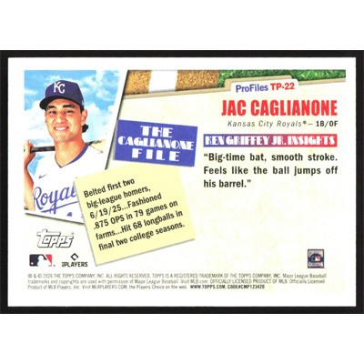 This is a 2026 Topps Profiles Jac Caglianone baseball card. The card is #TP-22 and pictures show condition.