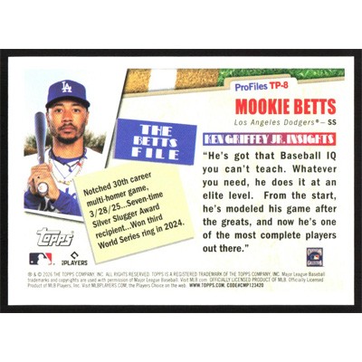 This is a 2026 Topps Profiles Mookie Betts baseball card. The card is #TP-8 and pictures show condition.