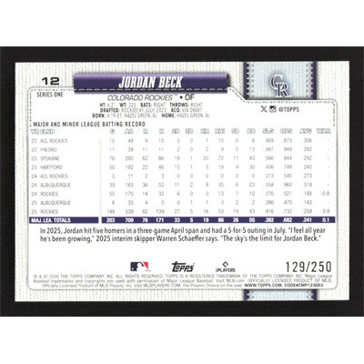 This is a 2026 Topps Purple Rainbow Foil Jordan Beck baseball card. The card is #12 and pictures show condition. This card is limited; #'d 129/250.