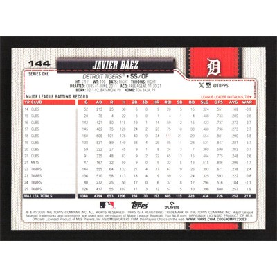 This is a 2026 Topps Rainbow Foil Javier Baez baseball card. The card is #144 and pictures show condition.