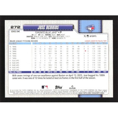 This is a 2026 Topps Rainbow Foil Jose Berrios baseball card. The card is #272 and pictures show condition.