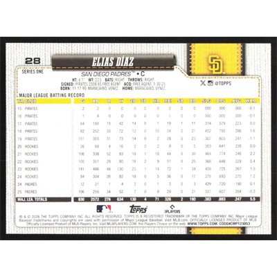 This is a 2026 Topps Rainbow Foil Elias Diaz baseball card. The card is #28 and pictures show condition.