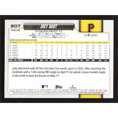 This is a 2026 Topps Sandglitter Joey Bart baseball card. The card is #207 and pictures show condition.