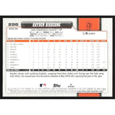 This is a 2026 Topps Sandglitter Hayden Birdsong Future Stars baseball card. The card is #296 and pictures show condition.